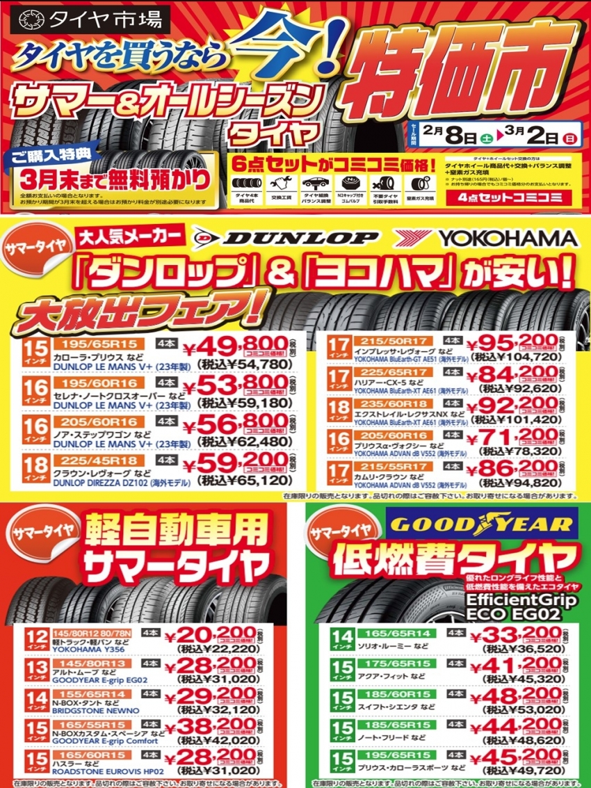 タイヤメーカー値上げ発表!! 買うなら今!! サマー&オールシーズンタイヤ特価市『開催中』2/8~3/2まで