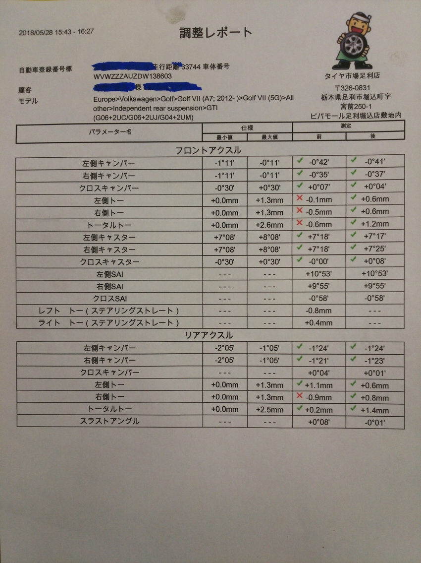 ゴルフ7でアライメント測定・調整!!