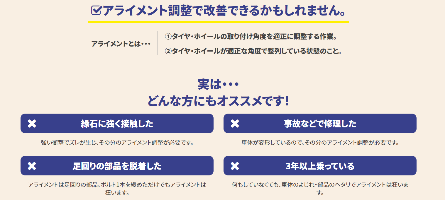 調整して適正な状態にすることで走りがスムーズになり、タイヤの寿命が延びたり燃費がぐんと良くなることもありますよ~。
