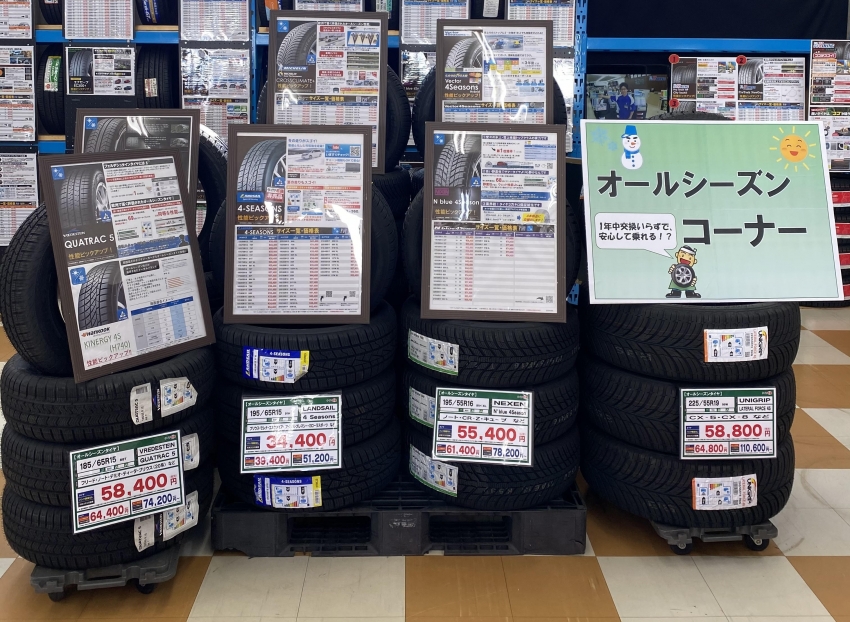 店舗の中には様々なオールシーズンタイヤ並んでおります!