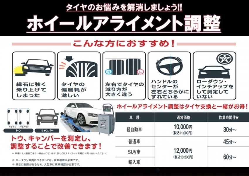 片側だけすり減っているとタイヤの寿命が半分ほど減ってしまいます(>_<)