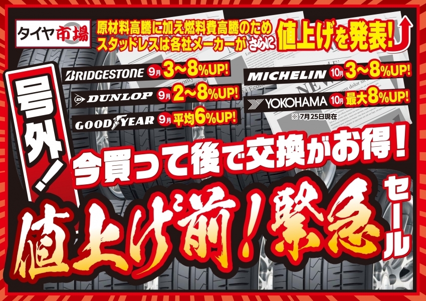 スタッドレスタイヤの値上げという事で多くの皆様のご来店いただいております❕