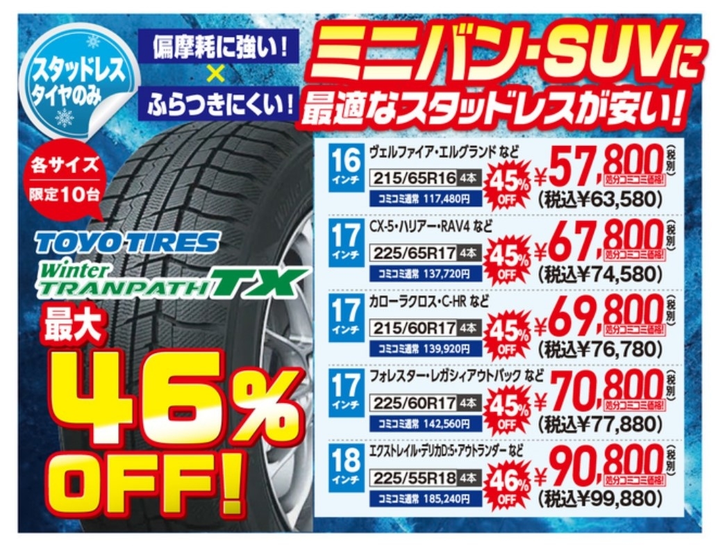 トーヨーのスタッドレスが最大で46%OFF!