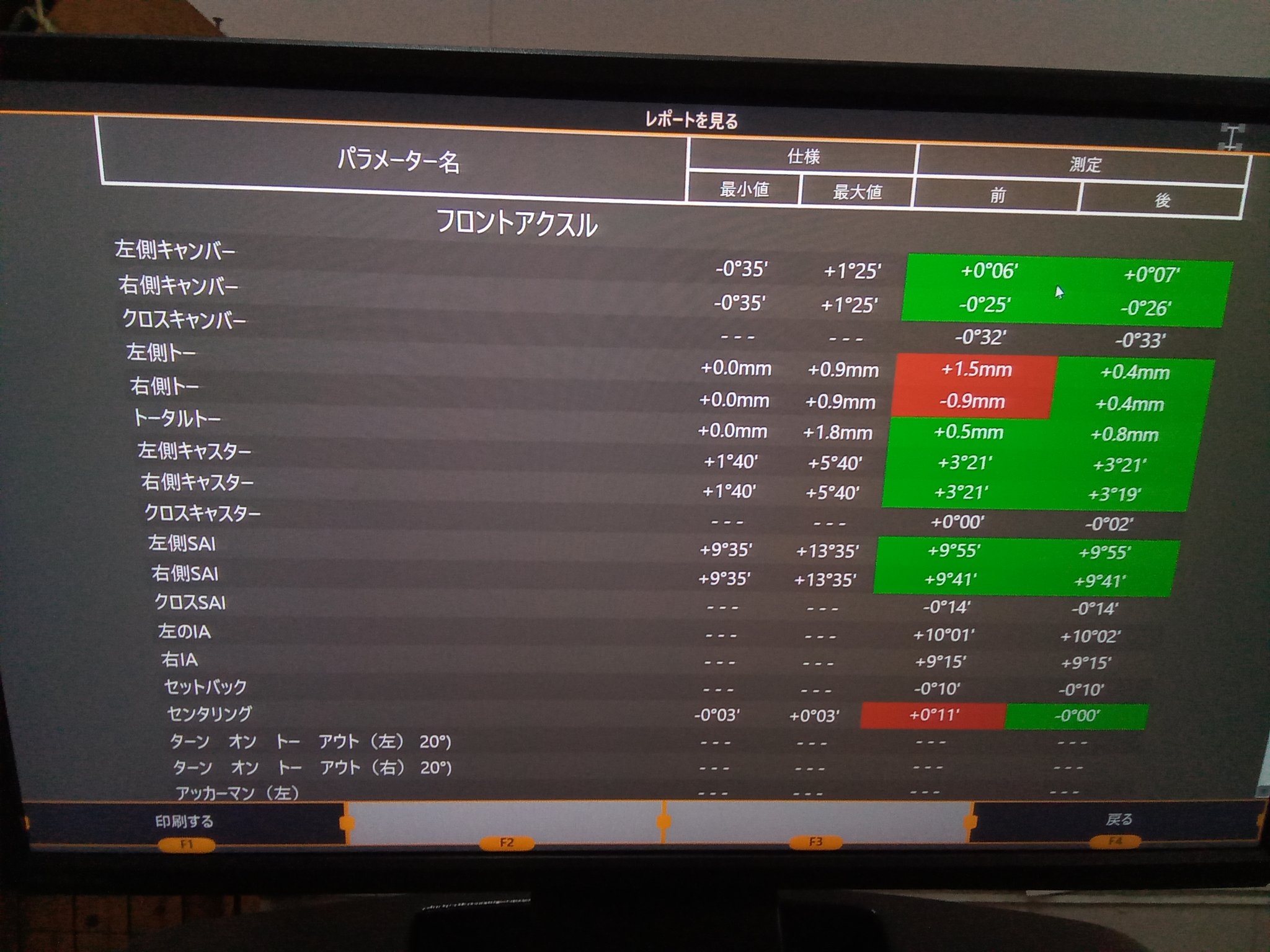 フロント左のトーが1.5mmトーイン、フロント右のトーが0.9mmトーアウト