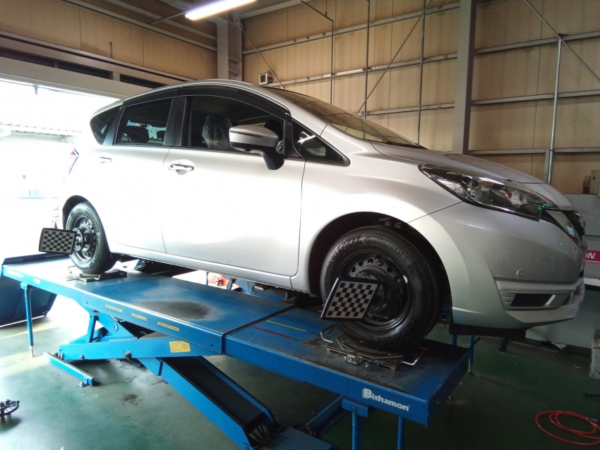 日産 ノート アライメント調整 in タイヤ市場足利店!!