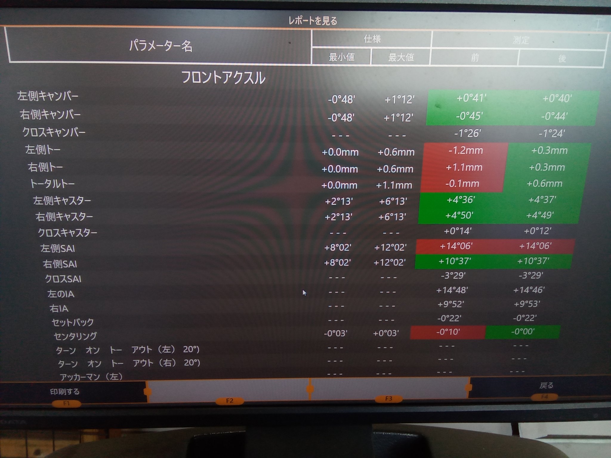 フロント左のトーが1.2mmトーアウト、フロント右のトーが1.1mmトーイン
