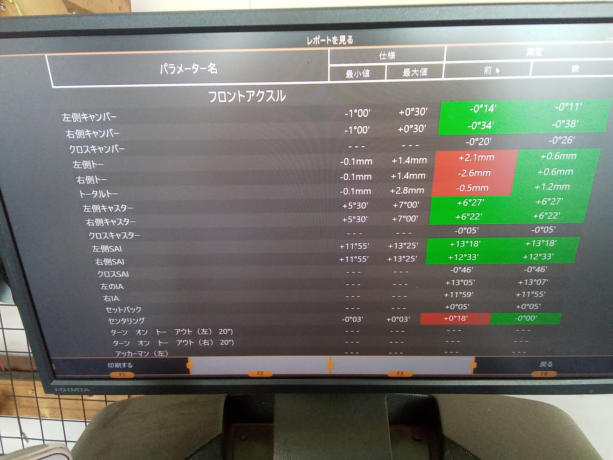 フロント左のトーが2.1mmトーイン、フロント右のトーが2.6mmトーアウト