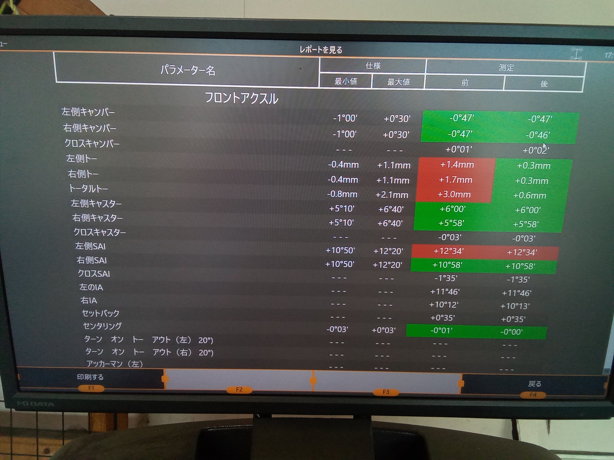 フロント左のトーが1.4mmトーイン、フロント右のトーが1.7mmトーイン