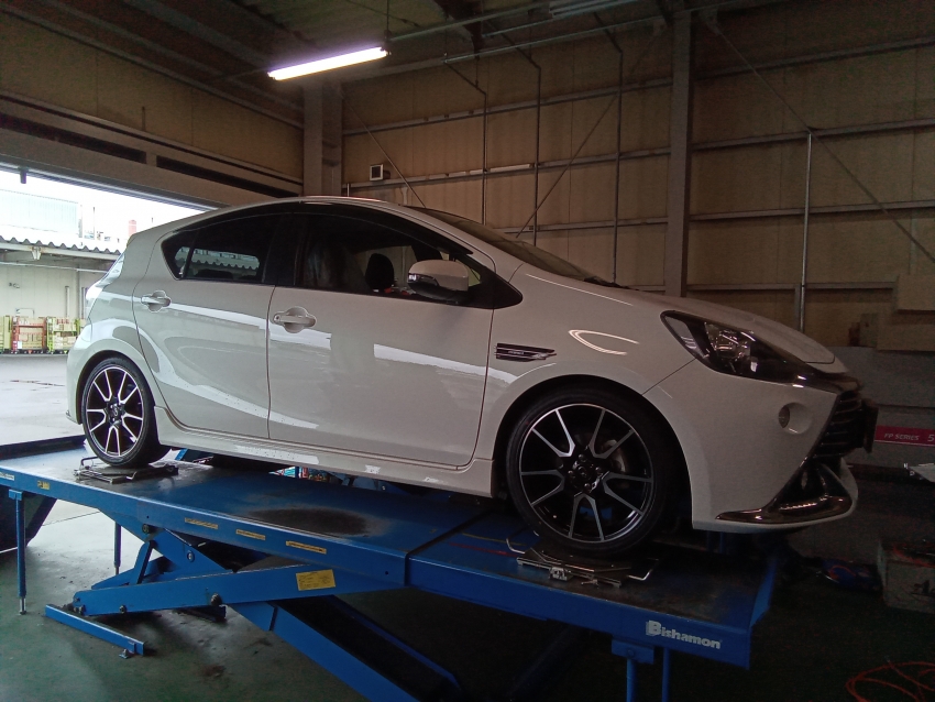 トヨタ→アクア アライメント調整 足利 桐生 太田でのアライメント調整は是非当店へお越しください
