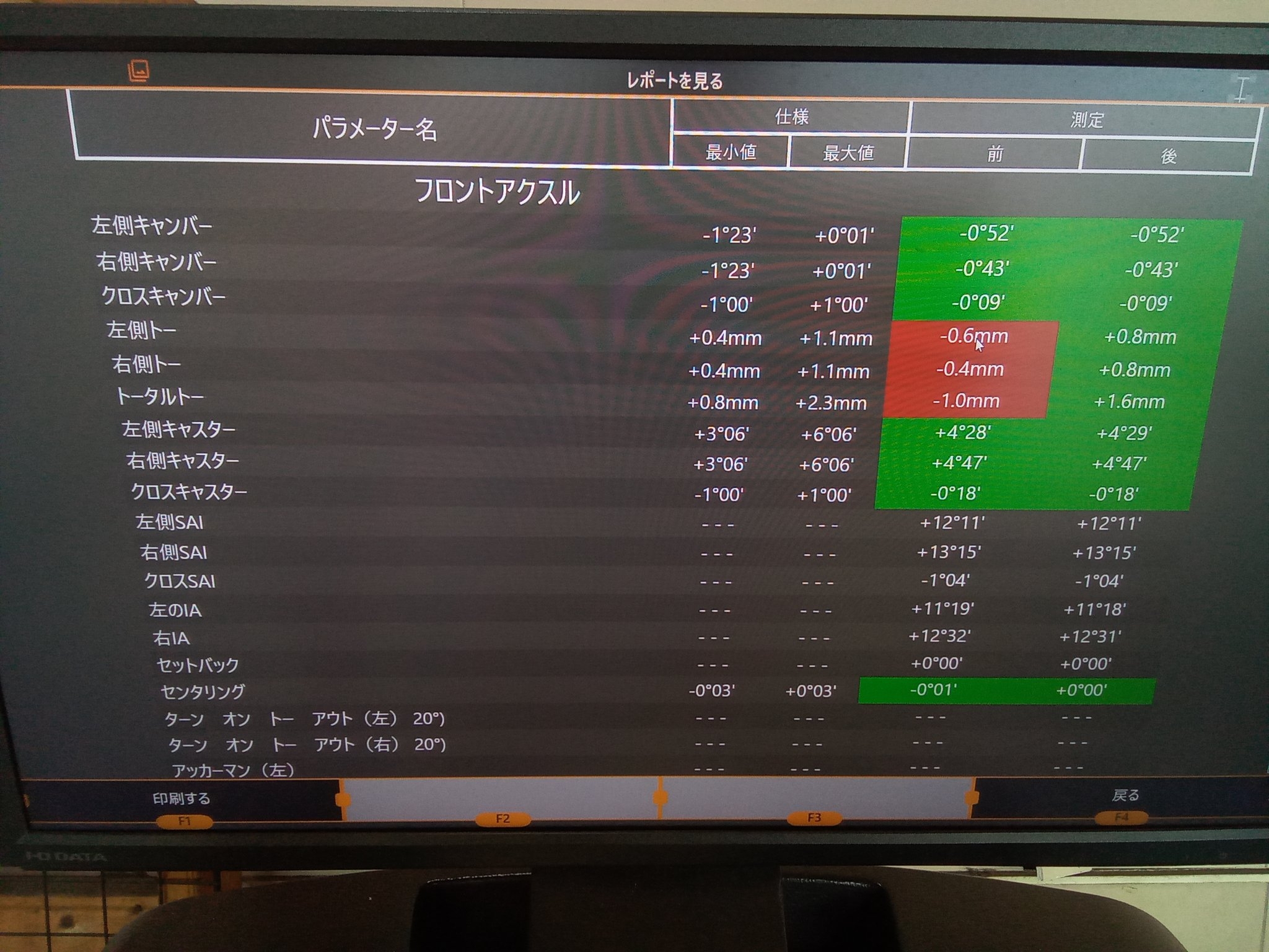 フロントタイヤの内減りが起こっていた為、アライメント調整を行いました( *´艸`)