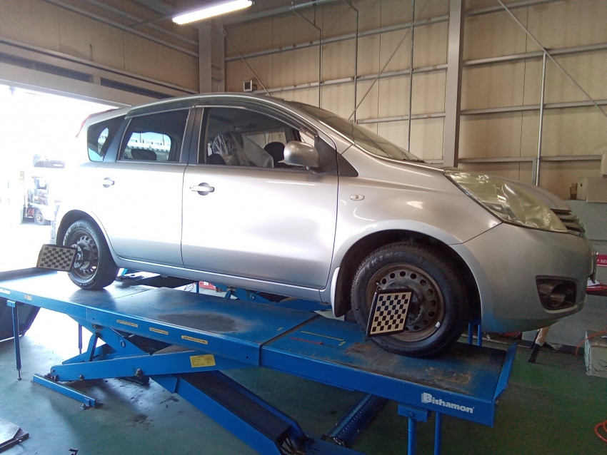 日産 ノート アライメント調整 in タイヤ市場足利店!!普通は超高いアライメント調整がディーラーの半額以下で!! 足利・太田・桐生エリアにお住いの方、その他の地域にお住いの方も是非!
