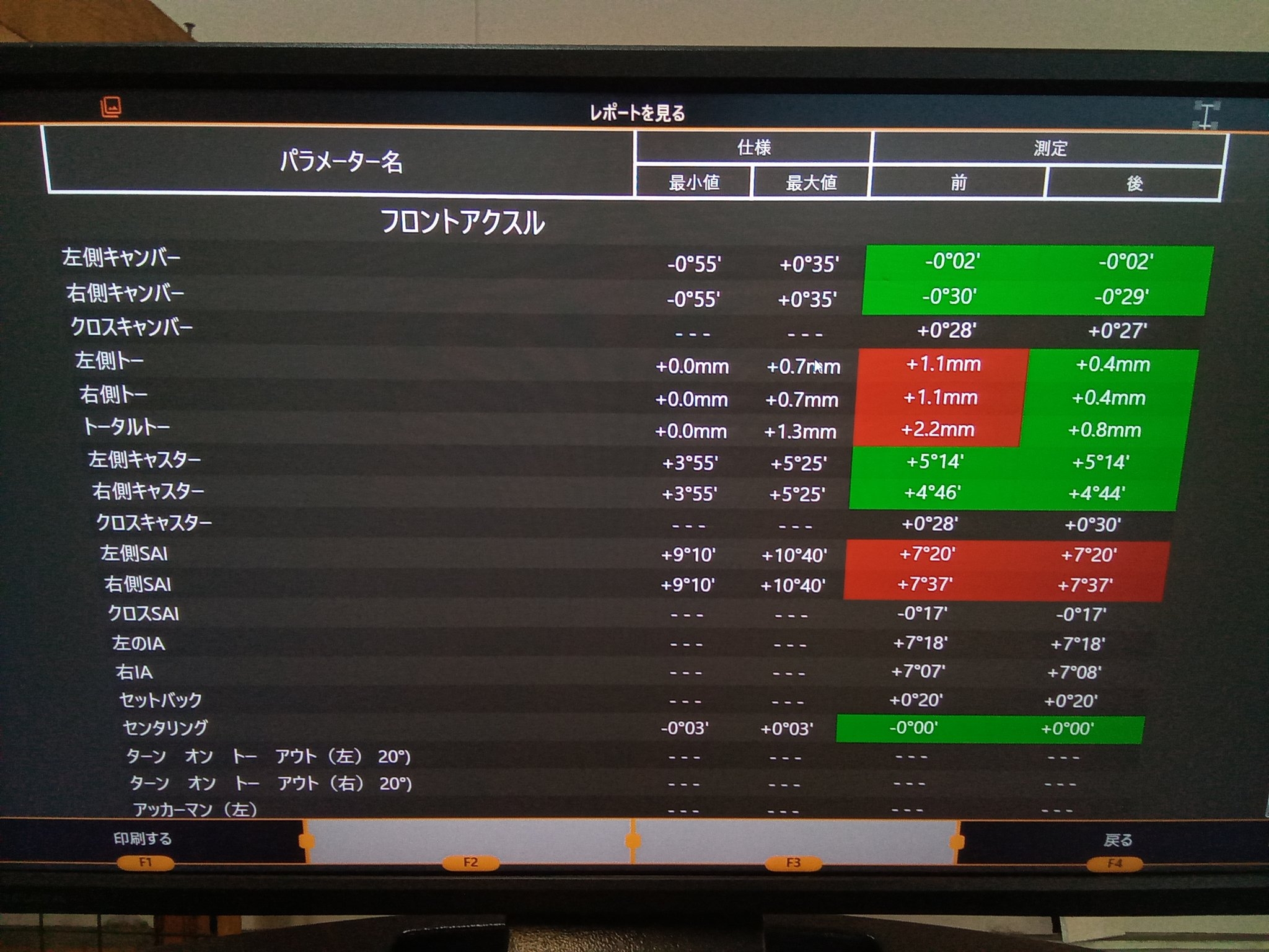 フロント左のトーが1.1mmトーイン、フロント右のトーが1.1mmトーイン