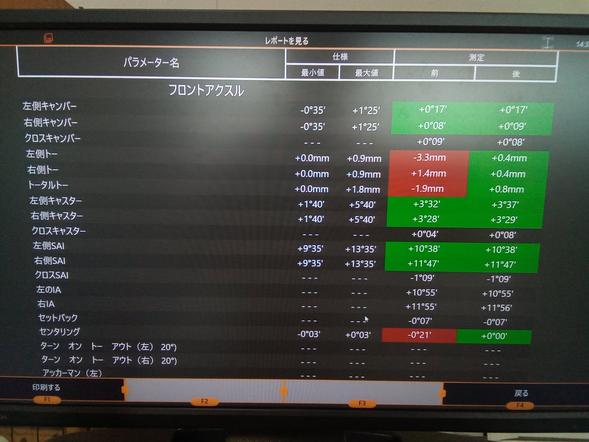 フロント左のトーが3.3mmトーアウト、フロント右のトーが1.4mmトーイン