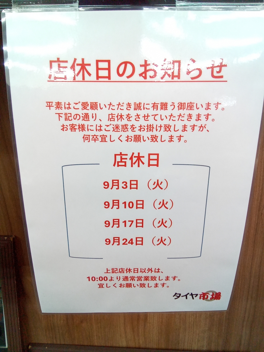 タイヤ市場足利店!9月の店休日のお知らせでございます!