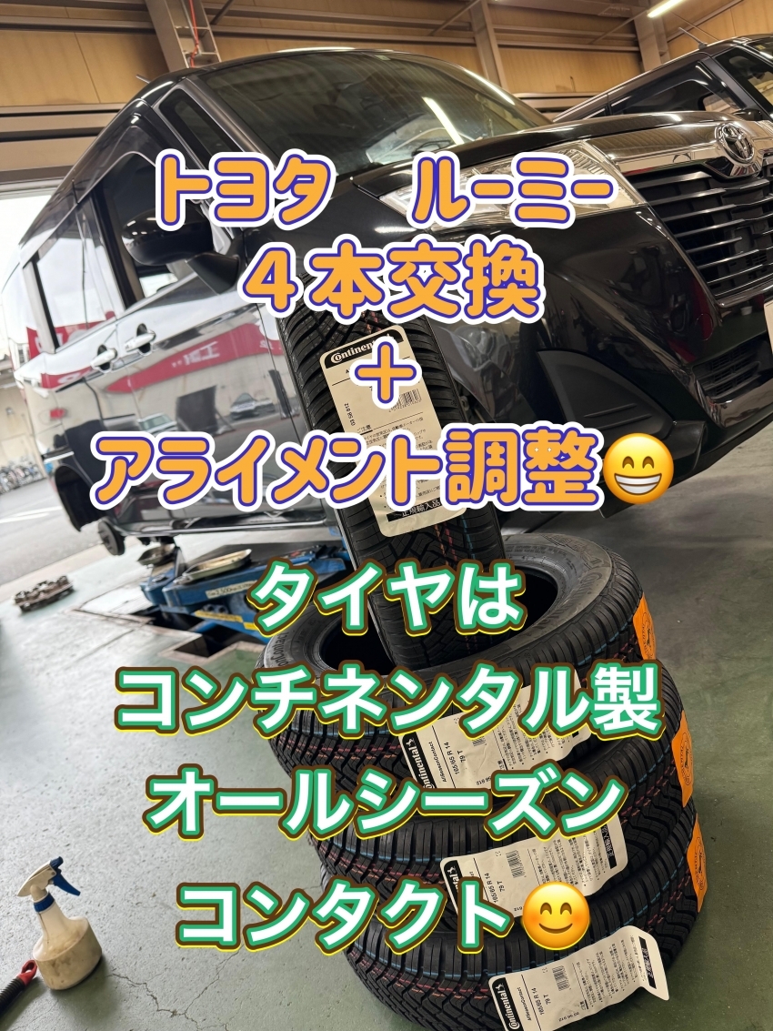 トヨタ ルーミー タイヤ交換とアライメント調整をお任せ頂きました!!タイヤはドイツメーカーコンチネンタル性のオールシーズンタイヤ!!是非、当店までお越しください!!足利以外にも太田・桐生・邑楽エリアにお住いの方、その他の地域にお住いの方も是非!