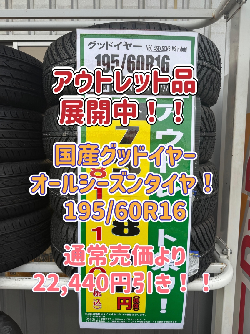【旧年製タイヤが安い!!】皆様、オールシーズンタイヤにご興味は御座いませんか?タイヤ市場足利店では、タイヤのアウトレットセールを開催中!!このお得な機会に是非お買い求め下さい!足利以外にも太田・桐生・邑楽エリアにお住いの方、その他の地域にお住いの方も是非!