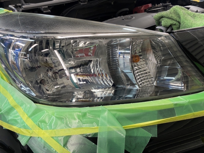 2つ目はヘッドライトの表面を微粒子のペーパーで研磨し、表面の古い角質を除去します。新たな素材部分を熱処理によって元のツルツルピカピカの状態を復元する施工方法がございます。