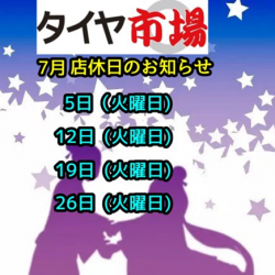 タイヤ市場伊勢崎宮子店でございます。明日の営業について7月12日(火曜日)...