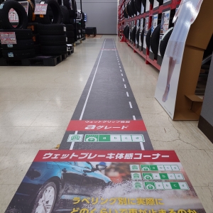 新しくなった水戸笠原店の店内にはラベリング試験におけるウェットブレーキ性能がど...