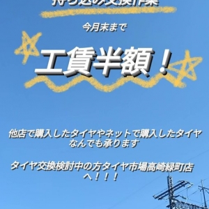 タイヤ市場高崎緑町店です。【お持ち込み交換作業5月中工賃半額】あと2日で終了で...
