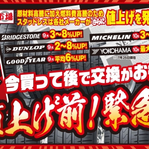 こんにちは!タイヤ市場駒形店です!今年も各メーカーが続々値上げ?!値上げ前の...
