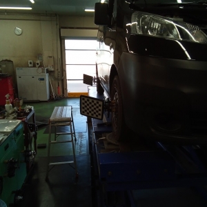 ニッサンバネットNV200でアライメント調整の入庫です!車が右に流れ、真...