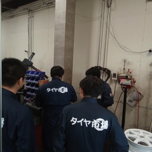 新人が先輩からタイヤの組み込みを教えて貰っている所をパシャリ!!タイヤ屋さんな...