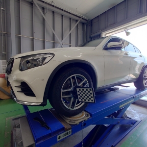 メルセデスベンツGLEクラスのアライメント作業です!タイヤの外減りが気になると...