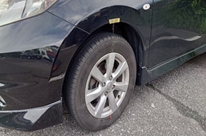前後のエンブレムなどを基準にして、車体の中心線と並行した糸をホイール付近に張ります。
