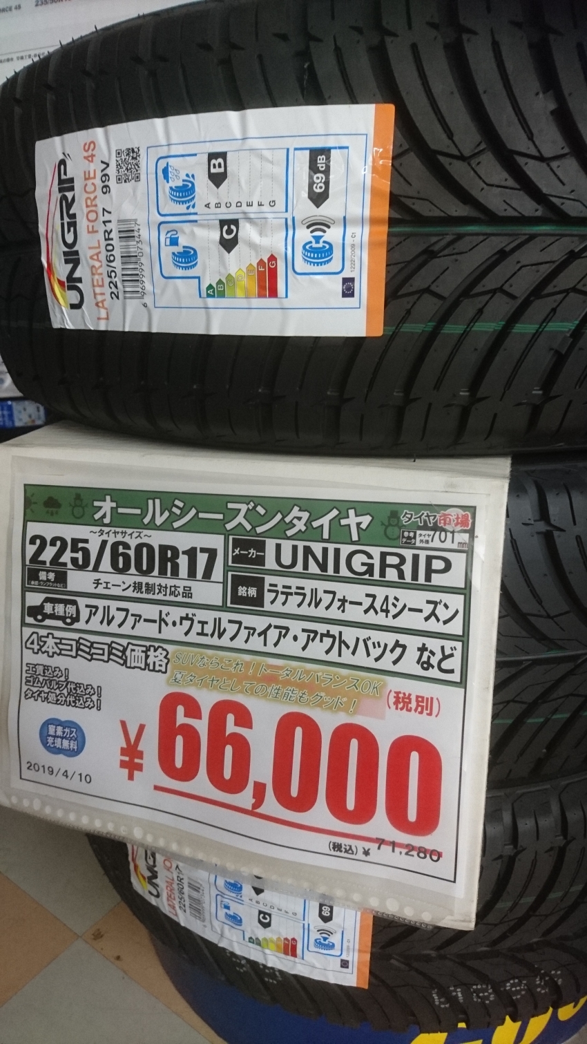 4本コミコミ66,000円(税抜き)夏、冬買ったイメージだと非常に 安い!!