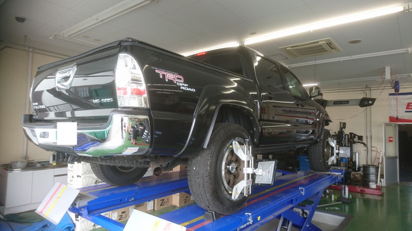本日作業の一幕!!北米トヨタのタコマでアライメント調整をさせて頂きました!!