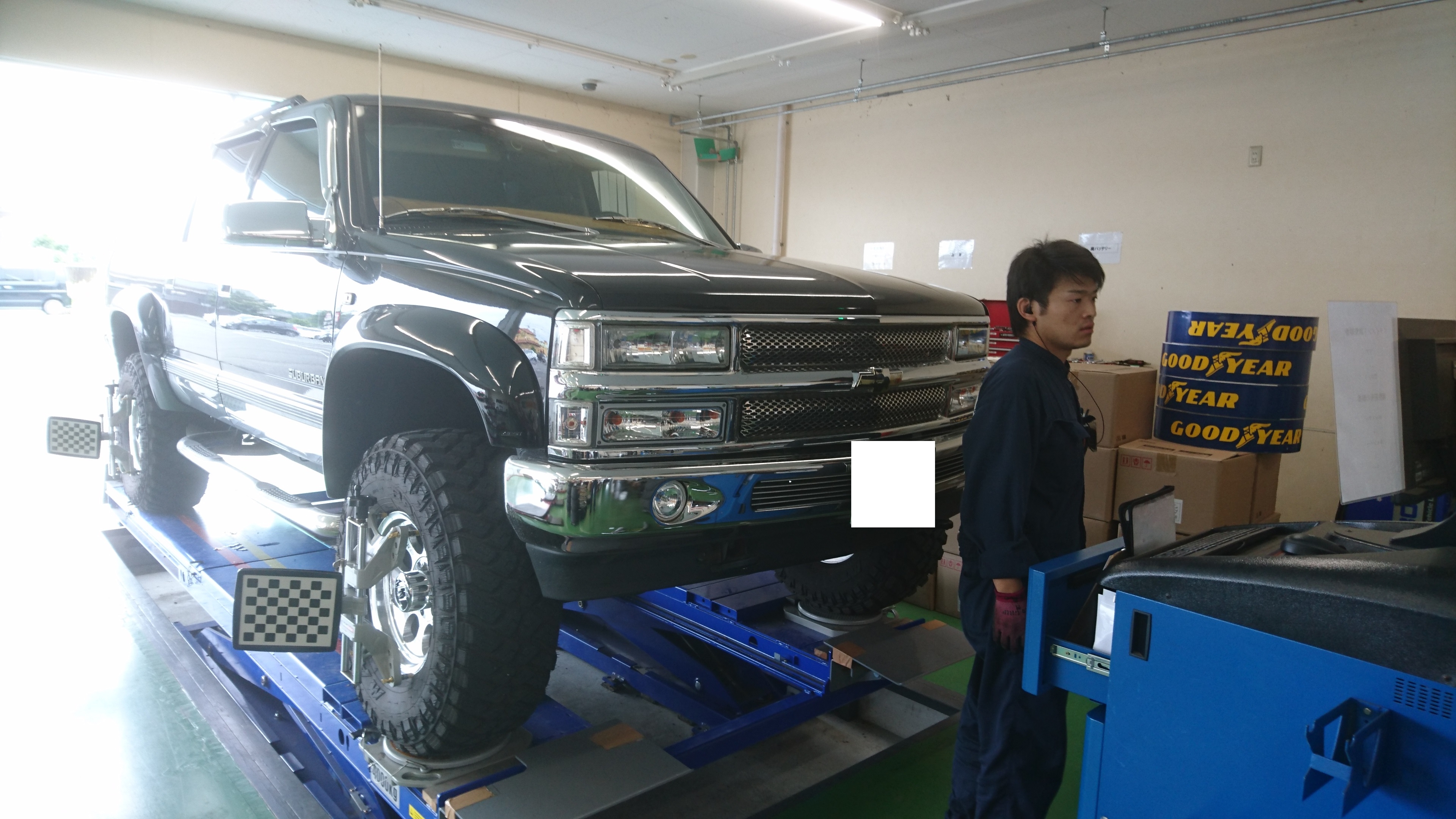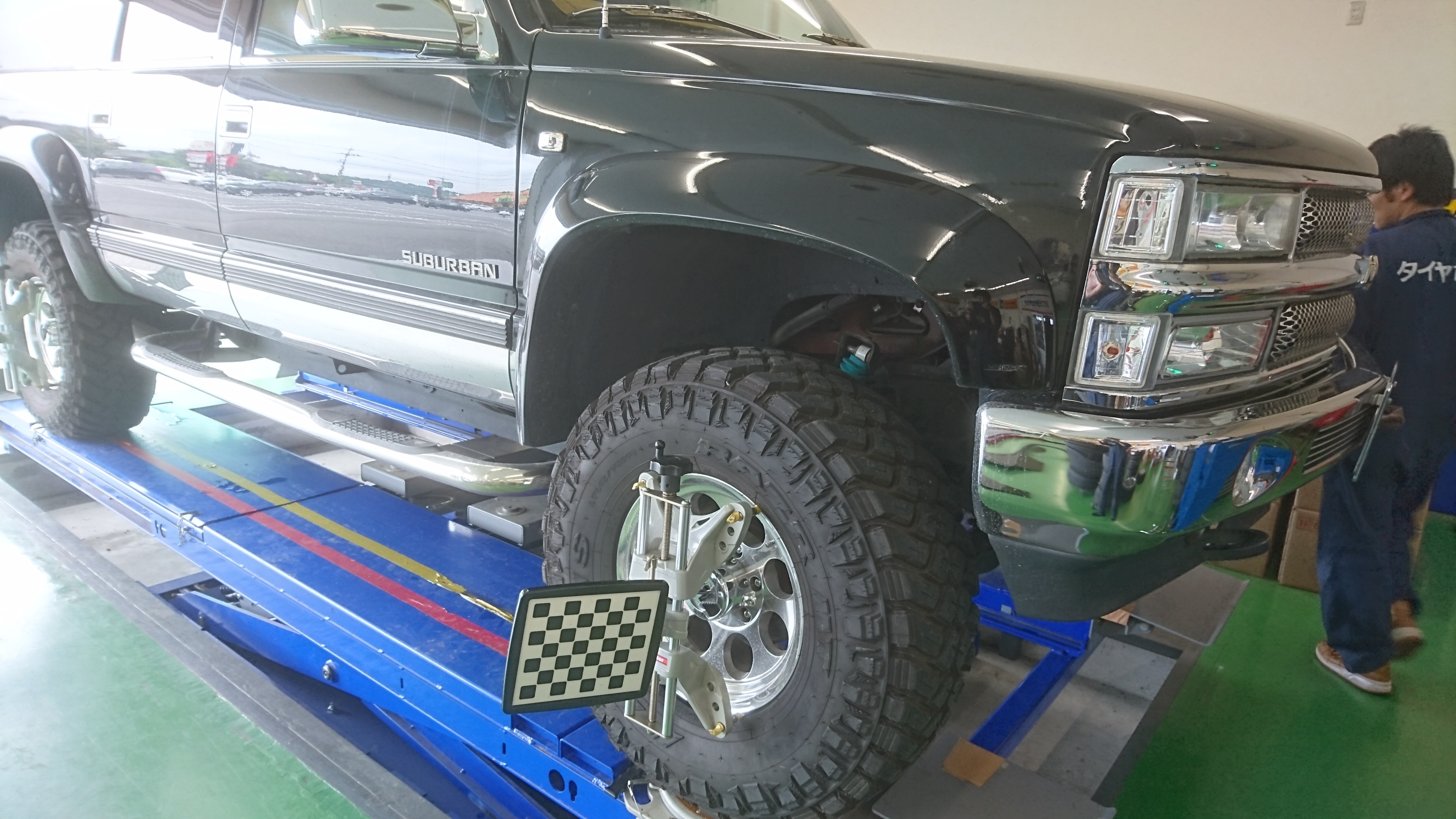 シボレーサバーバンでアライメント調整をさせて頂きました!!やはりこのクラスは大きいです!リフト一杯一杯です(汗)