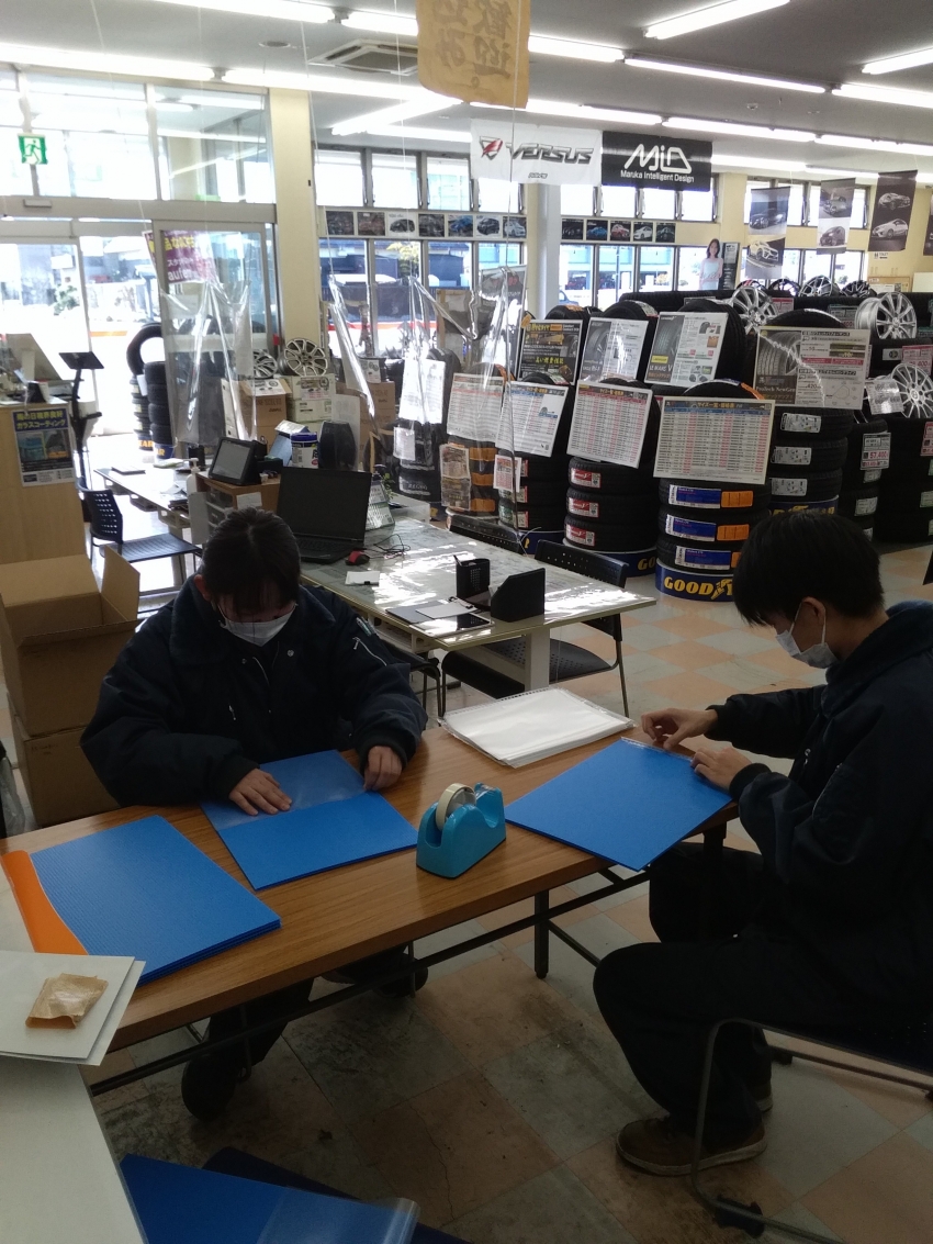 スタッフみんなで店内を夏タイヤのPOPを作り直してます。