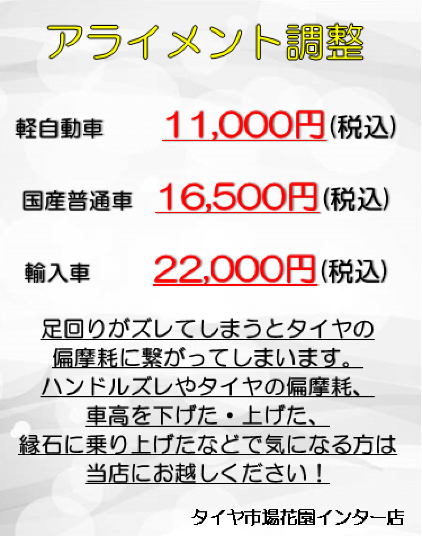 アライメント調整はタイヤ市場花園インター店へ!!