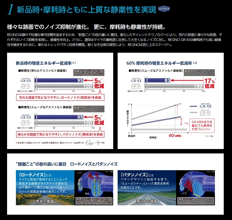 新品時は5%ノイズ低減、60%摩耗時には17%ノイズ低減ということは、摩耗が進んでも静粛性が低下しにくいという事ですね。