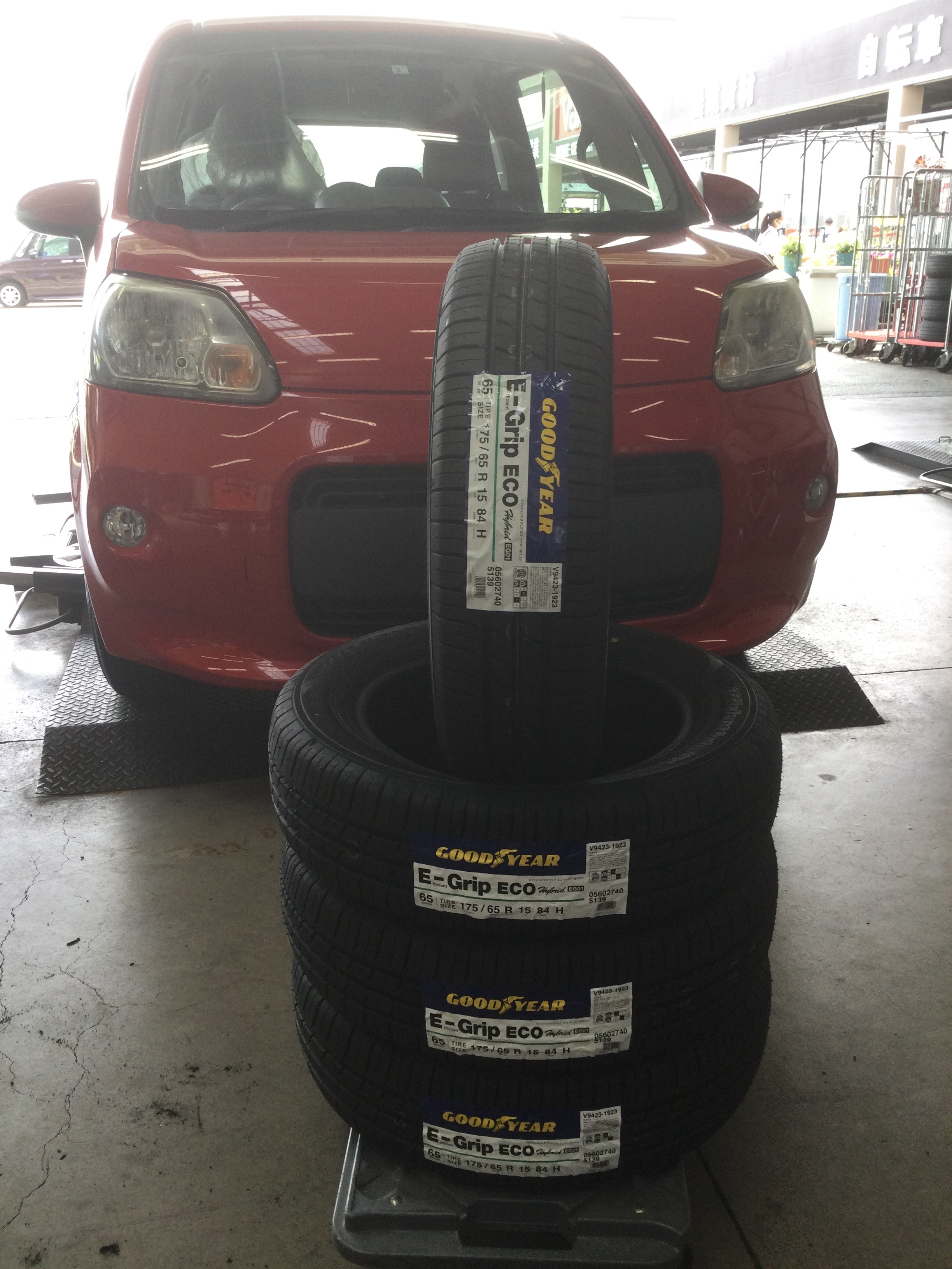 急きょタイヤ交換です。タイヤはグッドイヤーのEG01をお選び頂きました。サイズは175/65R15になります。