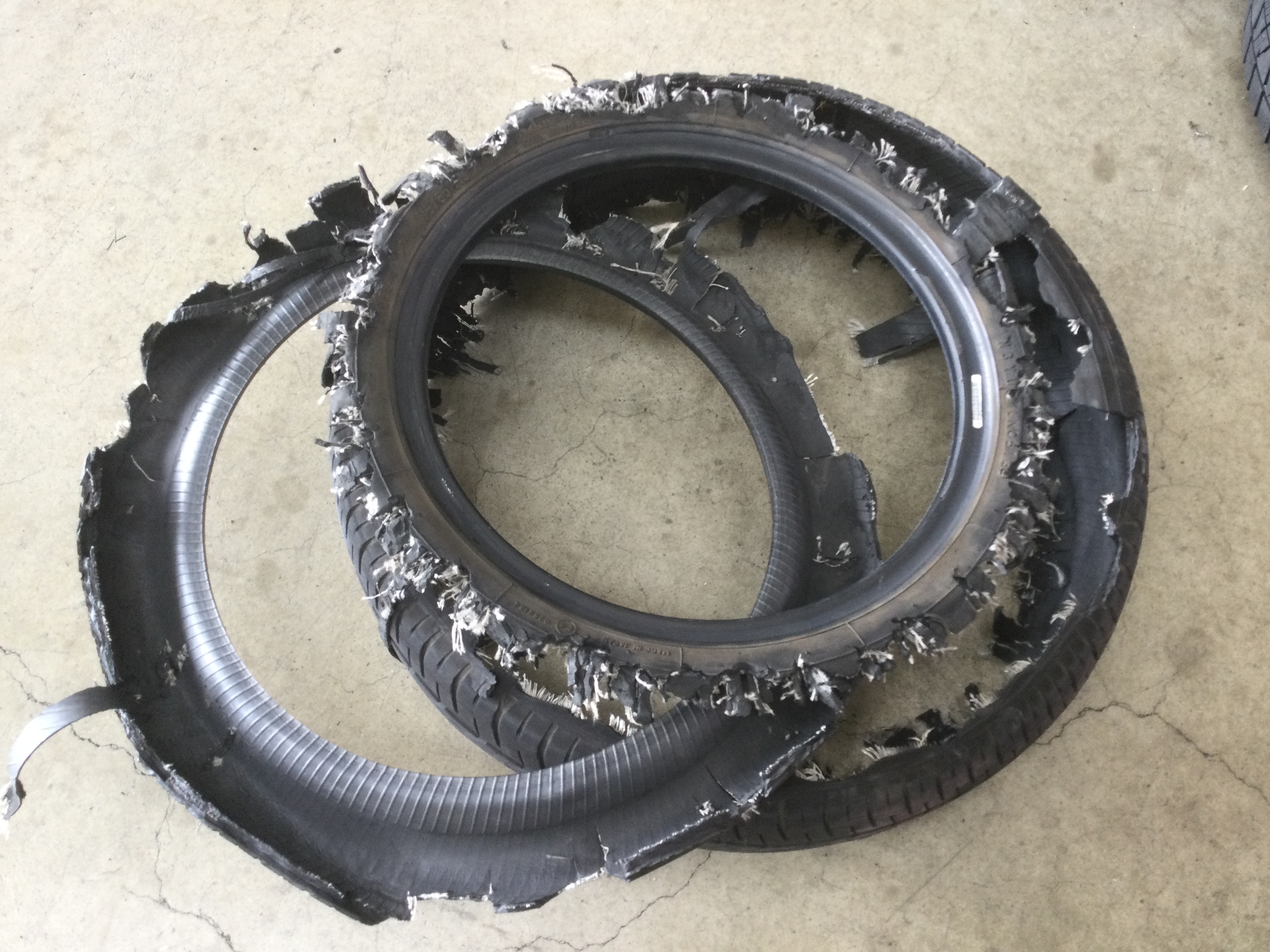 パンクに気付かずに走り続けた結果、タイヤが引き千切れました。