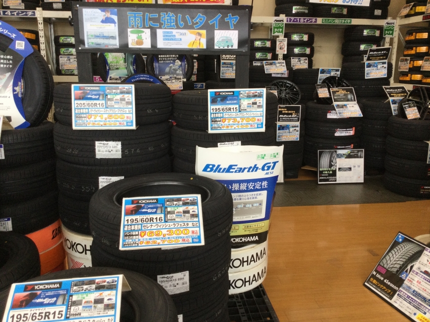 雨に強いYOKOHAMAを始め各種のタイヤを取り揃えておりますので、一度覗いてみてください♪ スッタフ一同お待ちしております¥(^^)