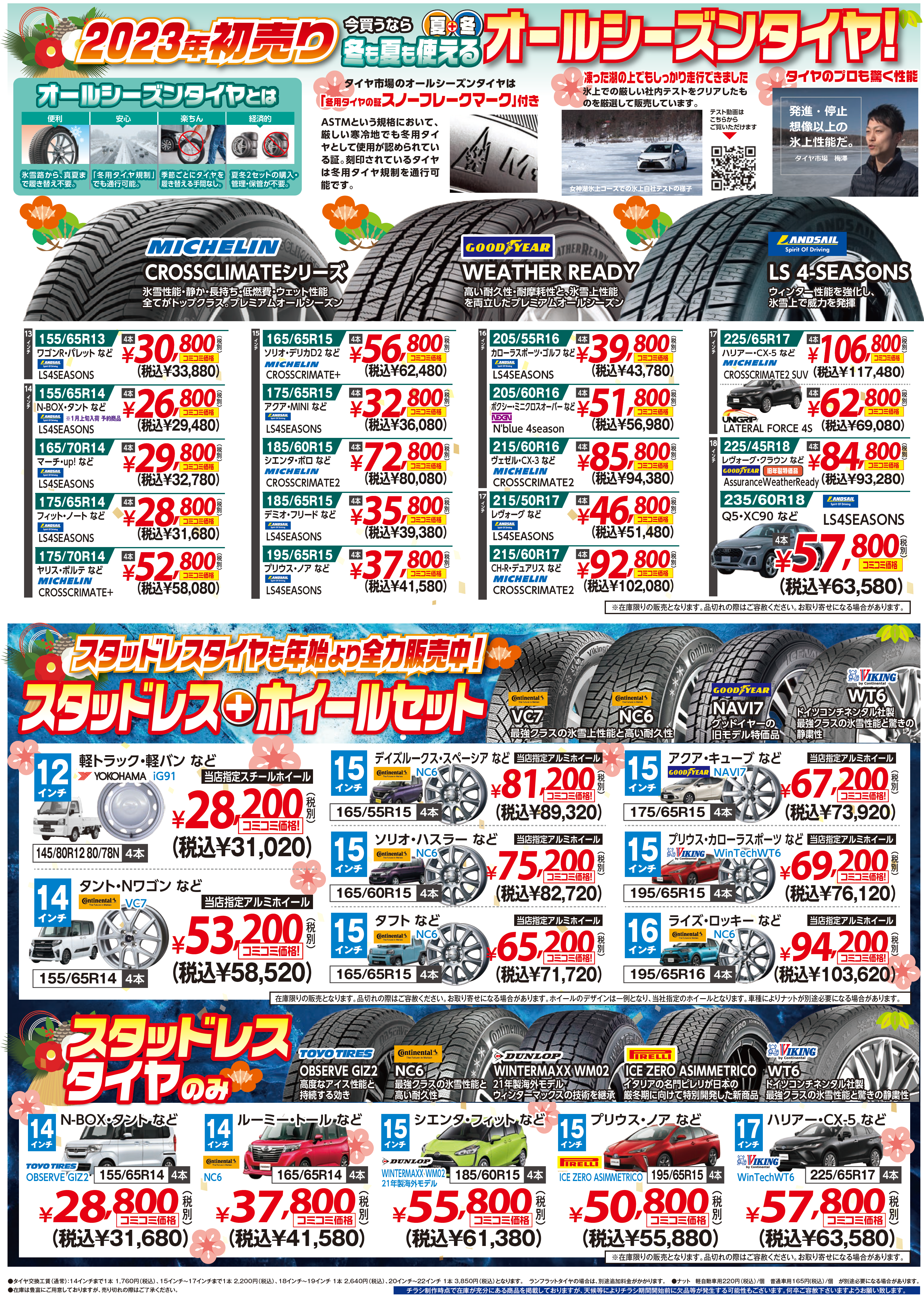 サマータイヤ、スタッドレスタイヤ、オールシーズンタイヤを数量限定、お値打ち価格でご準備しております!!