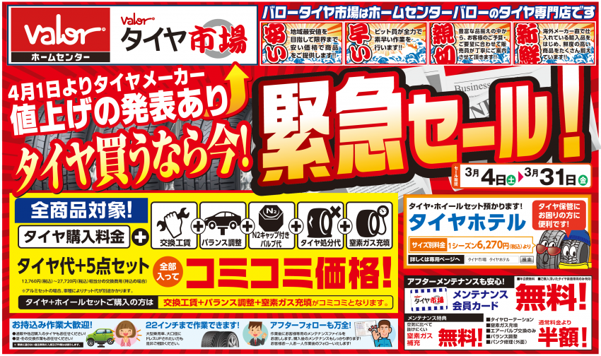 本日3/4(土)より、『タイヤを買うなら今!緊急セール!』を実施します!!