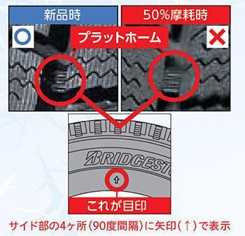 スタッドレスタイヤは残溝50%未満(プラットフォームが露出)になると、冬タイヤとして使用できません。(最初の写真)その為、稀に上記の様なお話を耳にすることがあります。