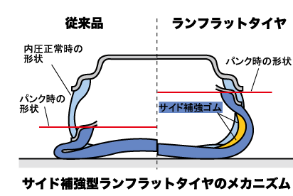 空気が無くてもしばらく走れるように、タイヤのサイドウォールが強化されています。
