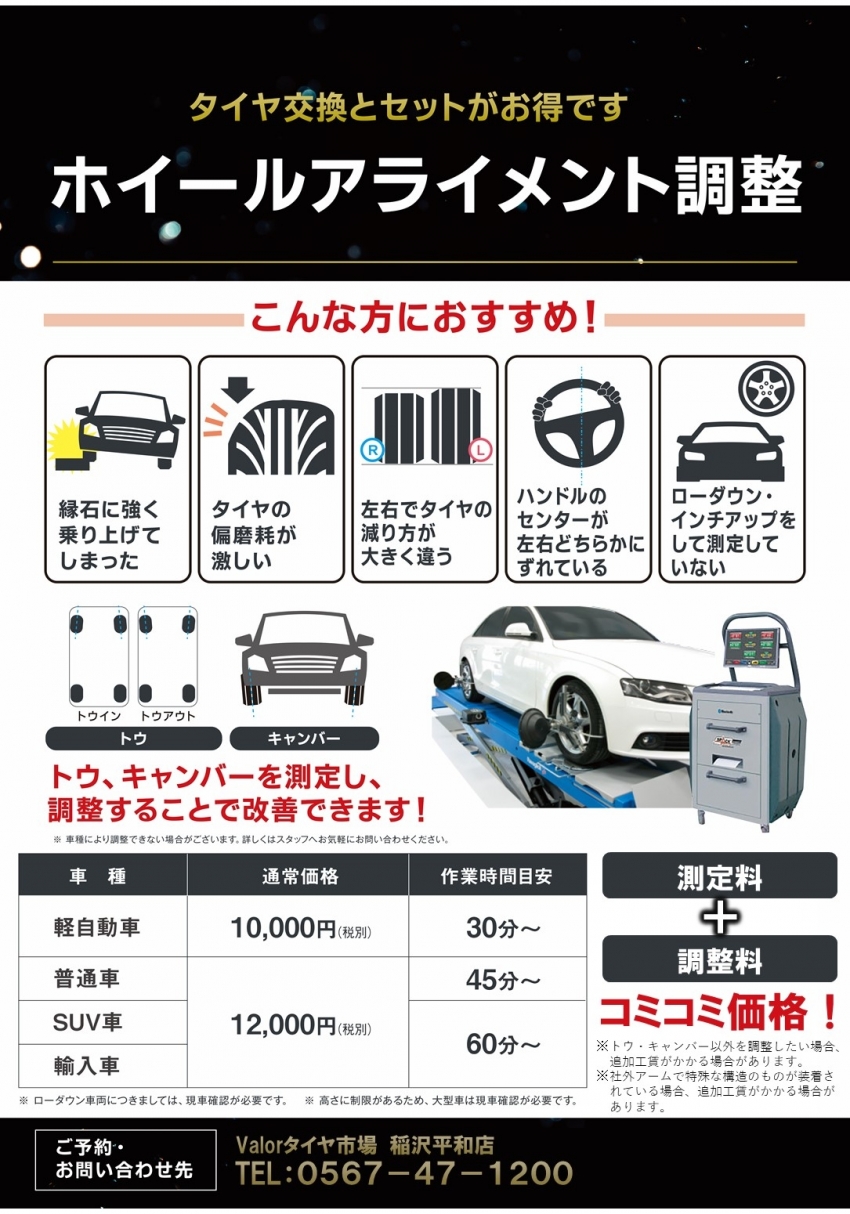 アライメント調整を行うことでタイヤの偏摩耗を抑制することができ、さらに燃費改善、ハンドリングの向上により安心して運転していただけます!!