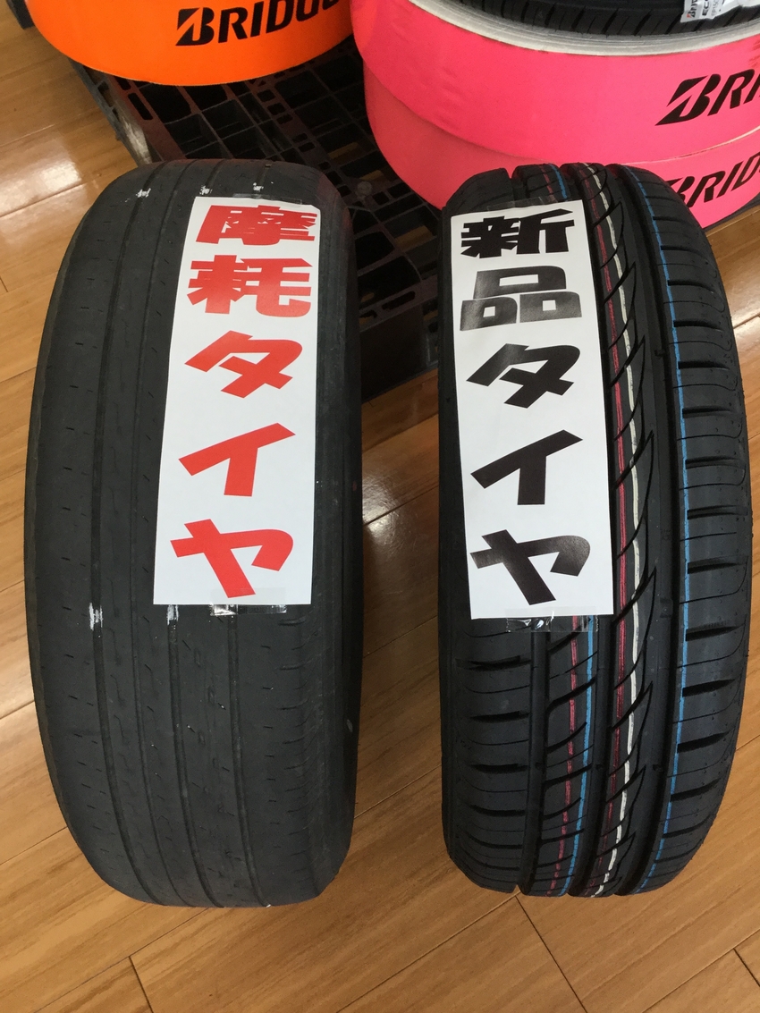 写真を見ても分かるように、摩耗タイヤと新品タイヤの違い