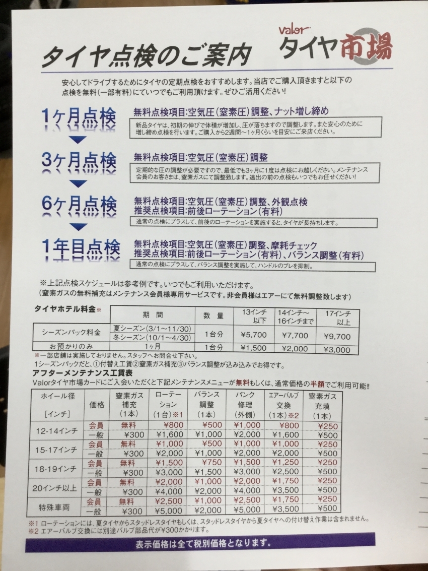 1年目点検:空気圧(窒素ガス)調整、摩耗チェック、前後ローテーション(有料)、バランス調整(有料)