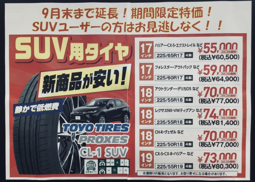 現在のチラシに掲載されている、トーヨータイヤのSUV向け夏タイヤ「PROXES CL-1 SUV」