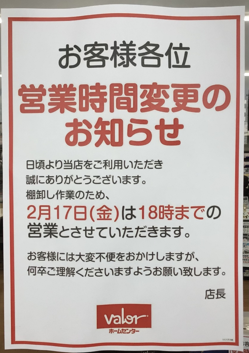 2月17日は誠に勝手ながら棚卸しの為営業時間を18時までと