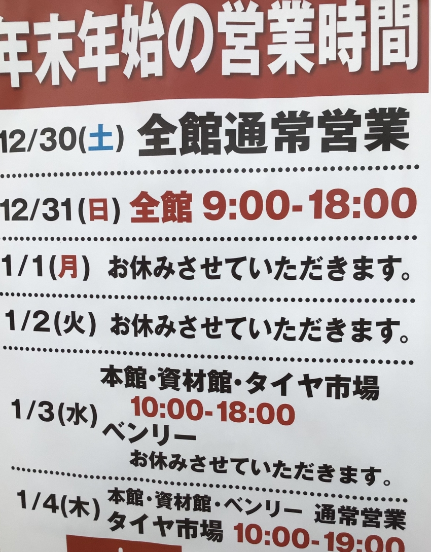 1/4からは通常営業となりますが、12月まではタイヤ市場は9:00〜20:00までの営業をしておりましたが、1月〜2月は10:00〜19:00までの営業時間となります。