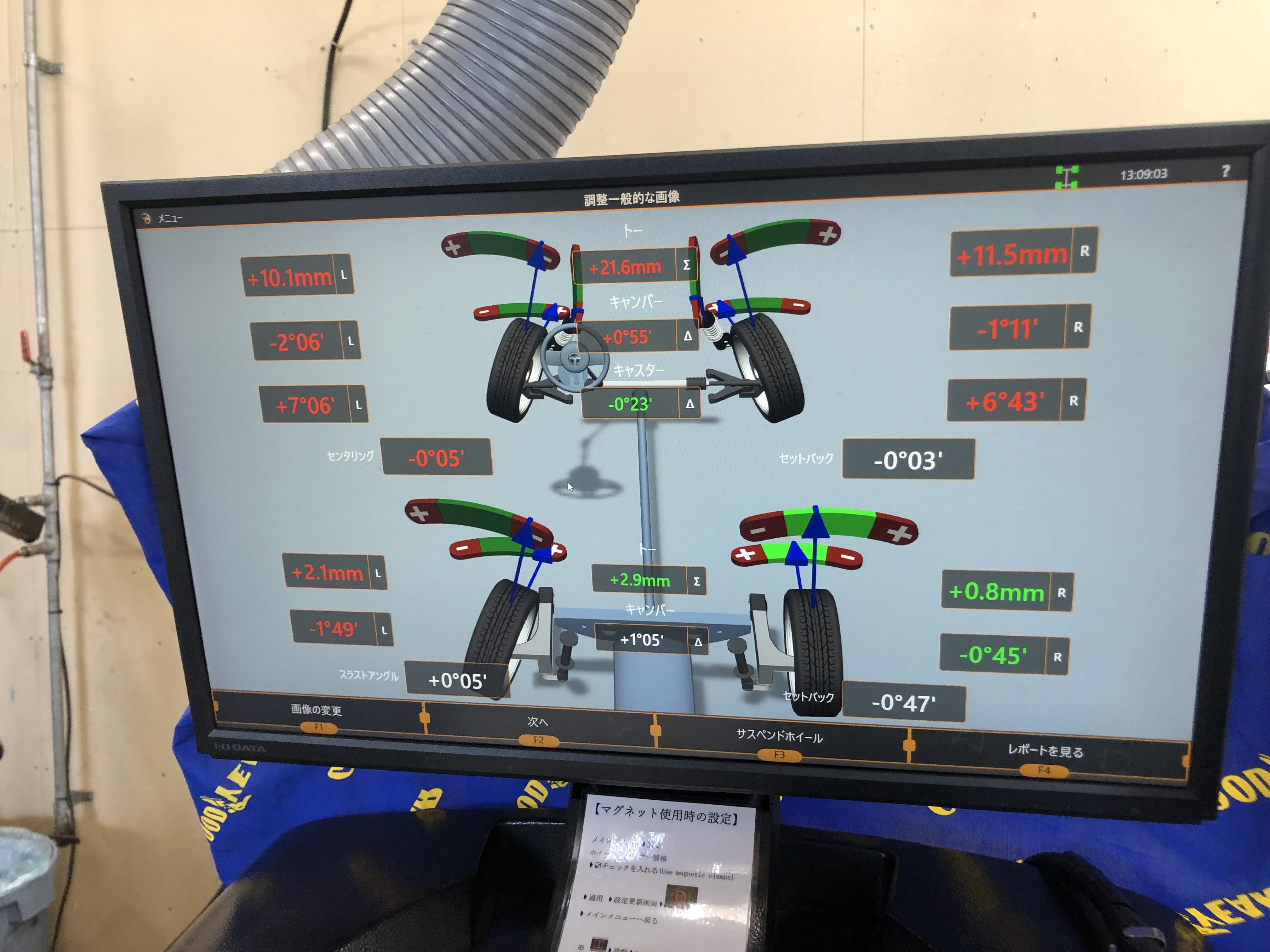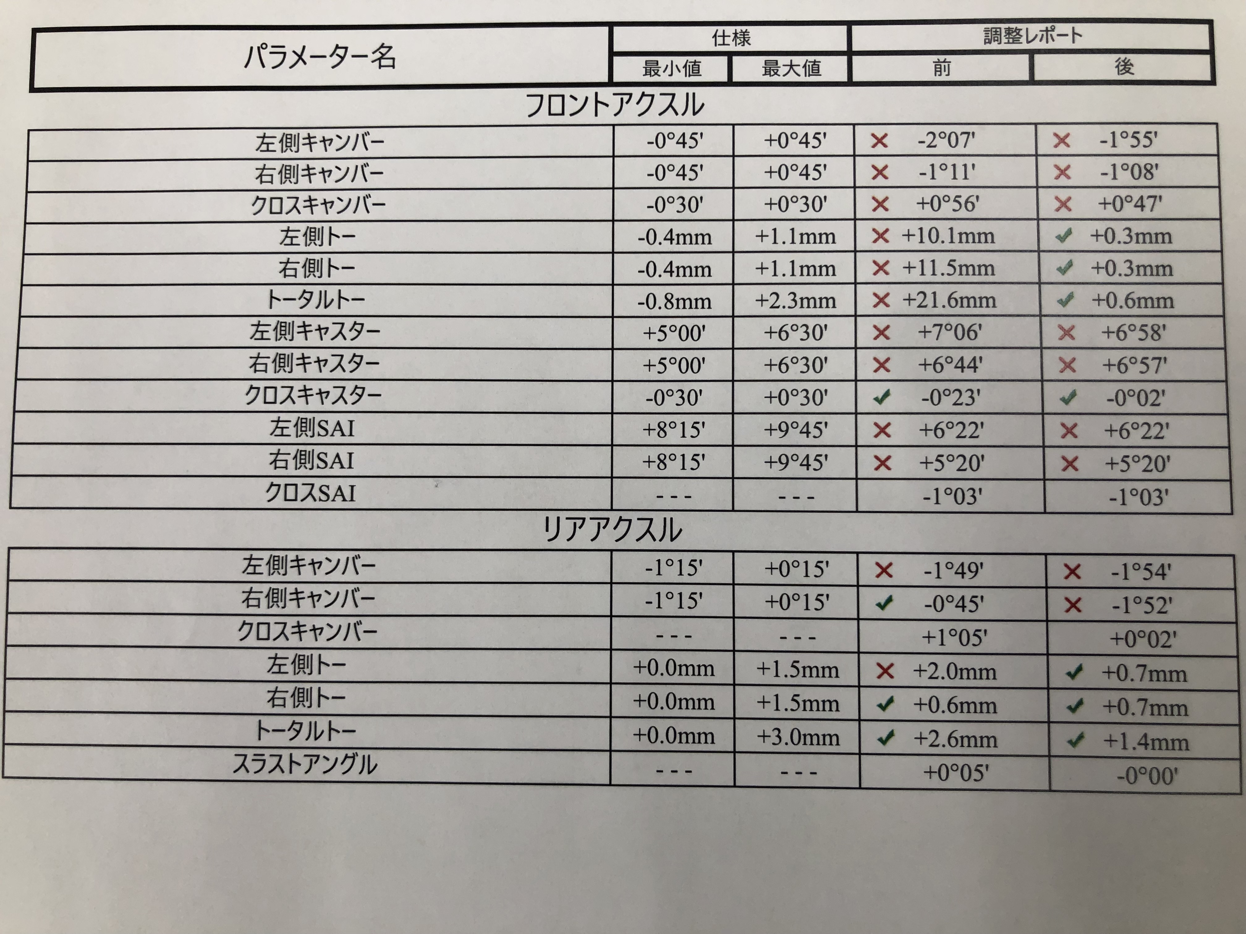 フロントは調整幅の限界もあってこういった数値にさせていただきましたが、キャスター角を左右揃えることができました。それに一番気になっていたフロントトーがかなり改善!