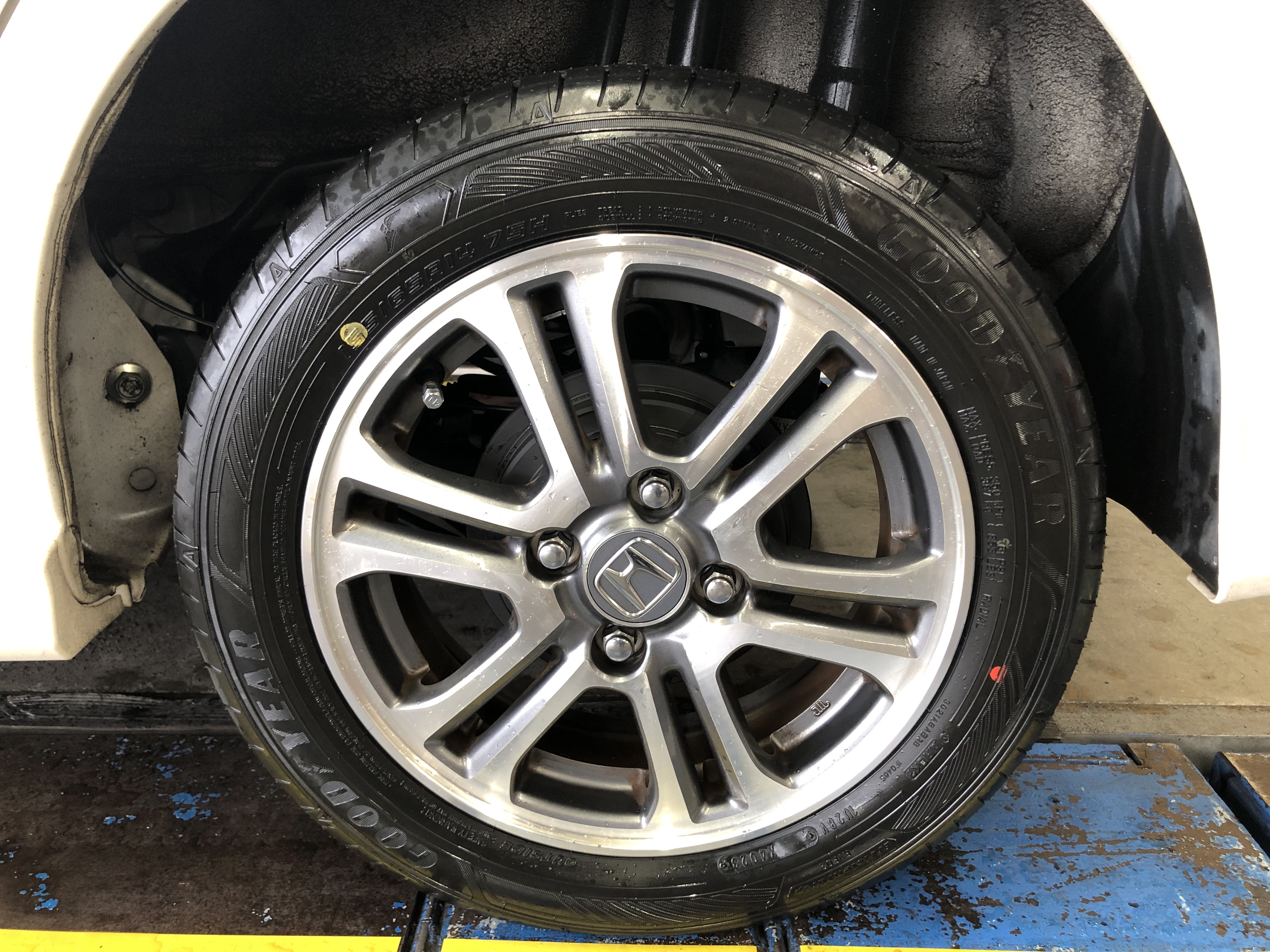 N-BOXのお客様にご来店いただきました。装着されていたタイヤ外側が特に摩耗していたため偏摩耗に強いタイヤ、グッドイヤーのエフィシェントグリップRVF02をご購入いただきました。